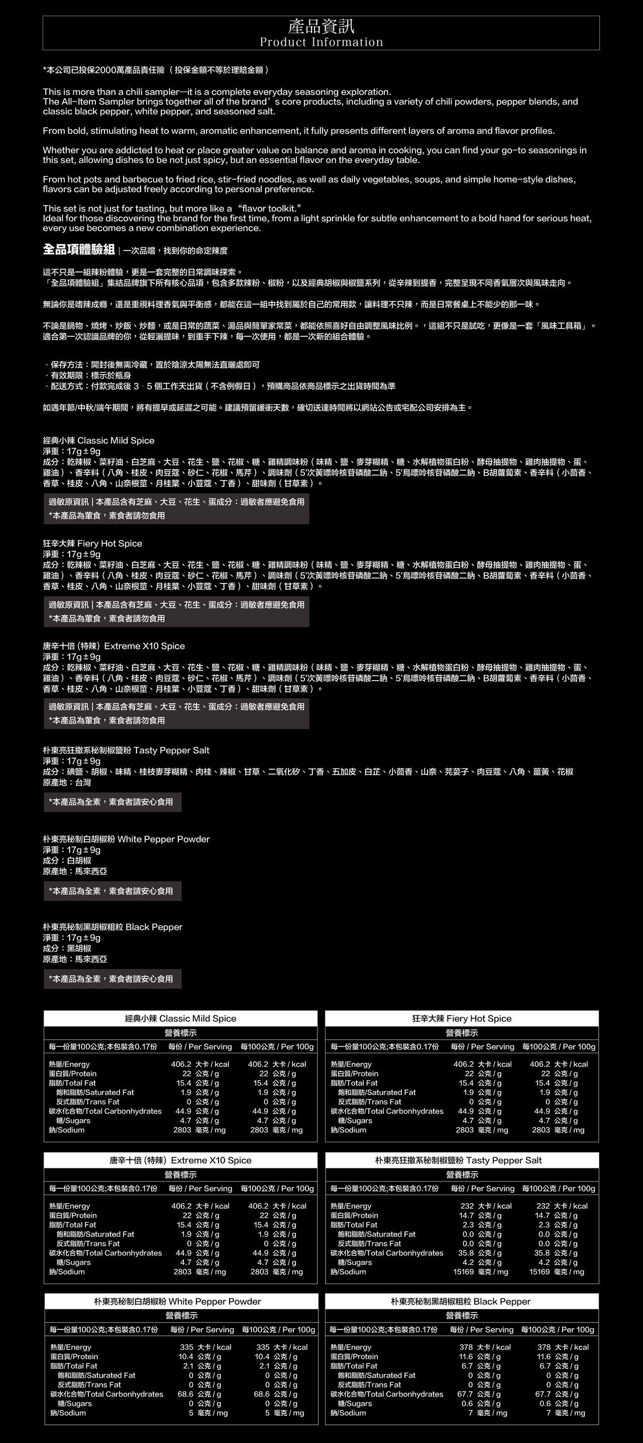 商品口味|經典小辣(葷)、狂辛大辣(葷)、唐辛十倍(葷)、秘制椒鹽(素)、純白胡椒粉(素)、黑胡椒粗粒(素)